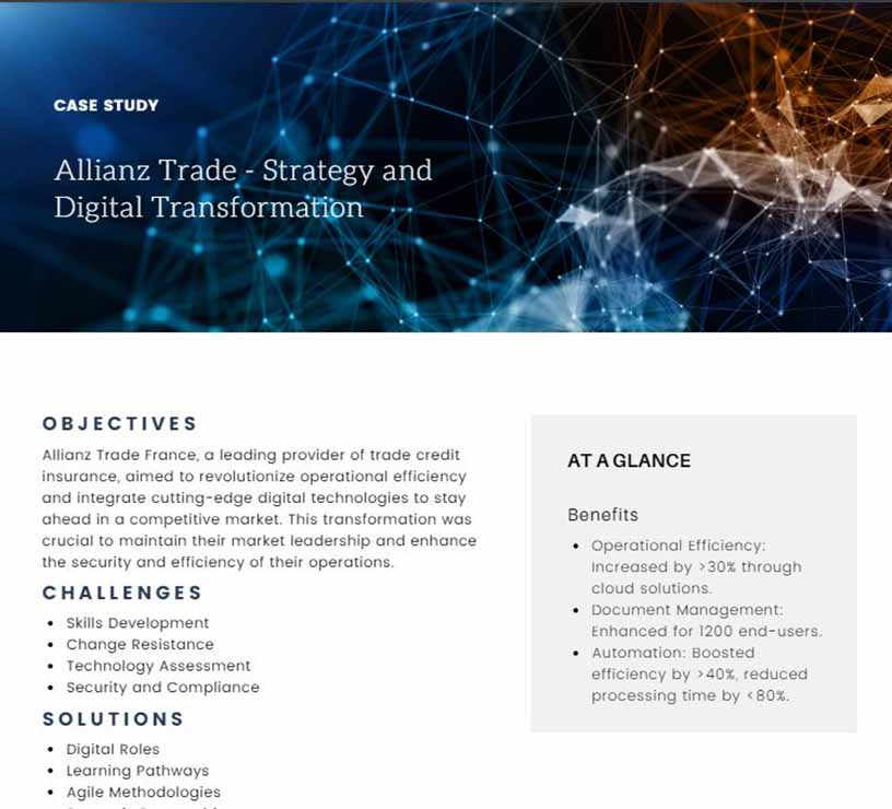 Allianz Trade France, a leading provider of trade credit insurance, aimed to revolutionize operational efficiency and integrate cutting-edge digital technologies to stay ahead in a competitive market. This transformation was crucial to maintaining their market leadership and enhancing the security and efficiency of their operations.